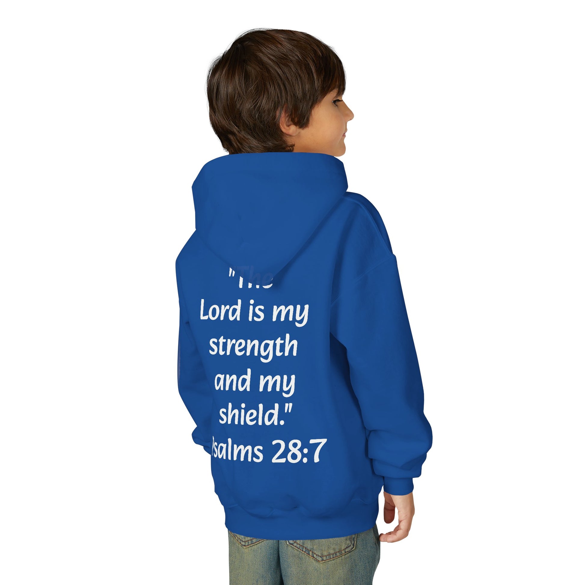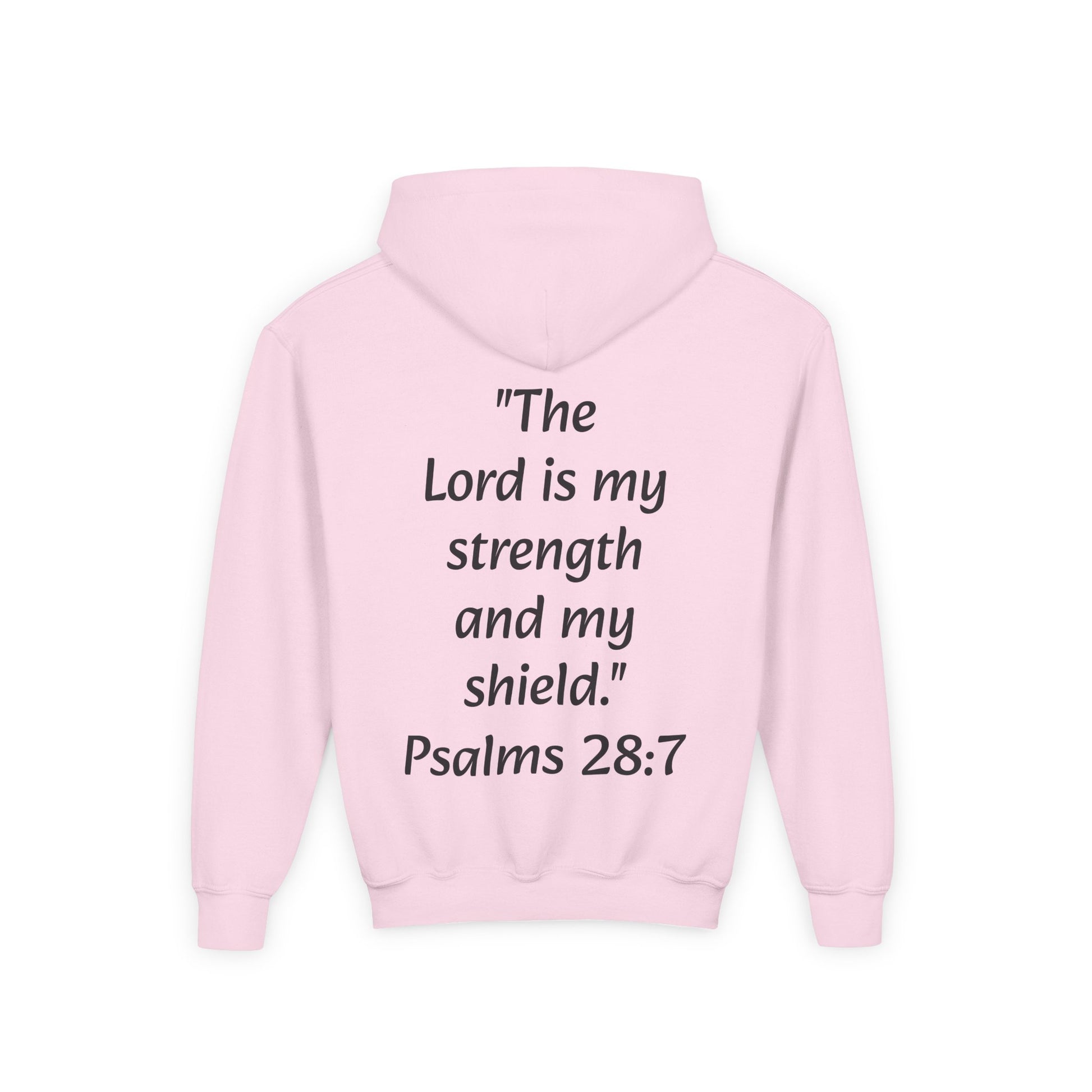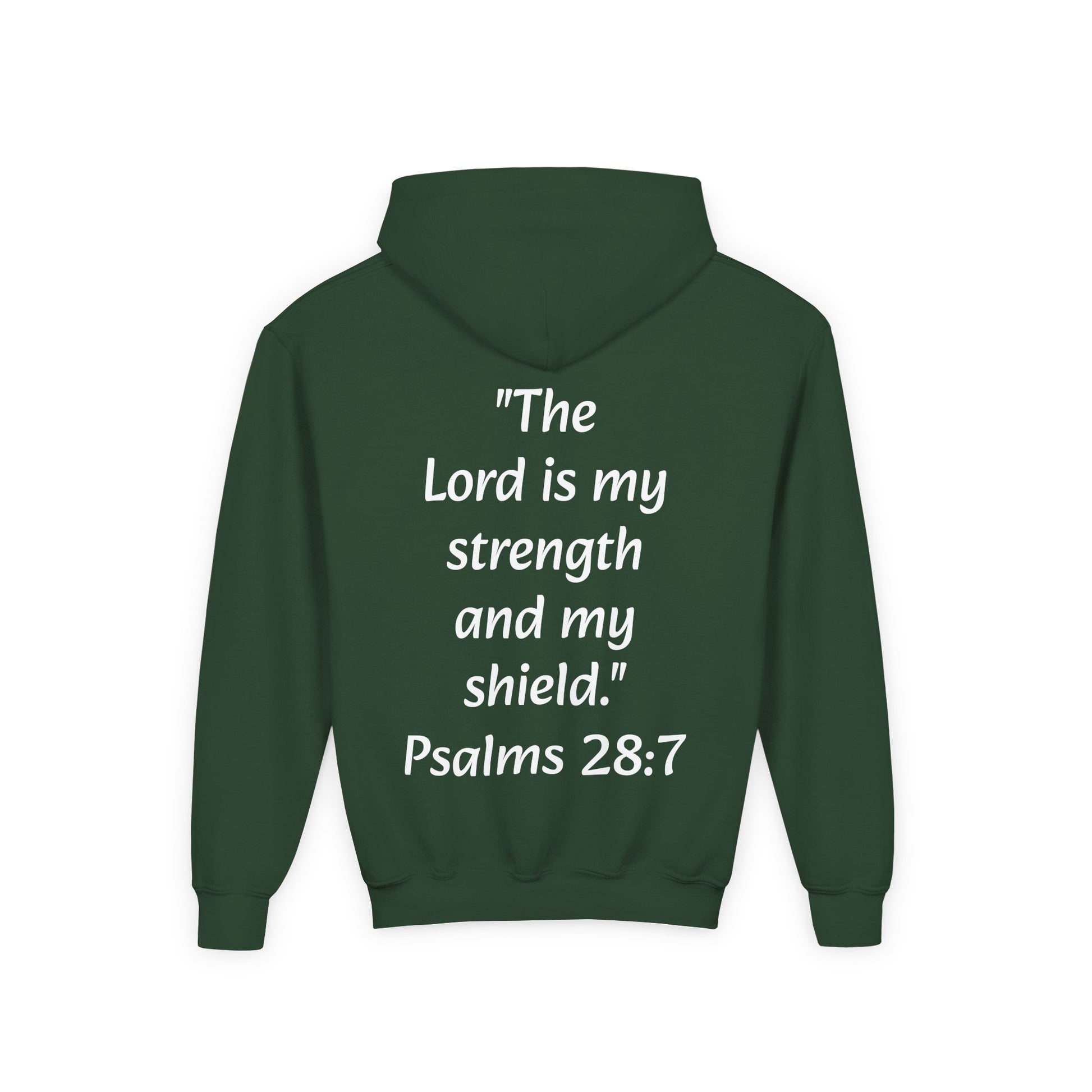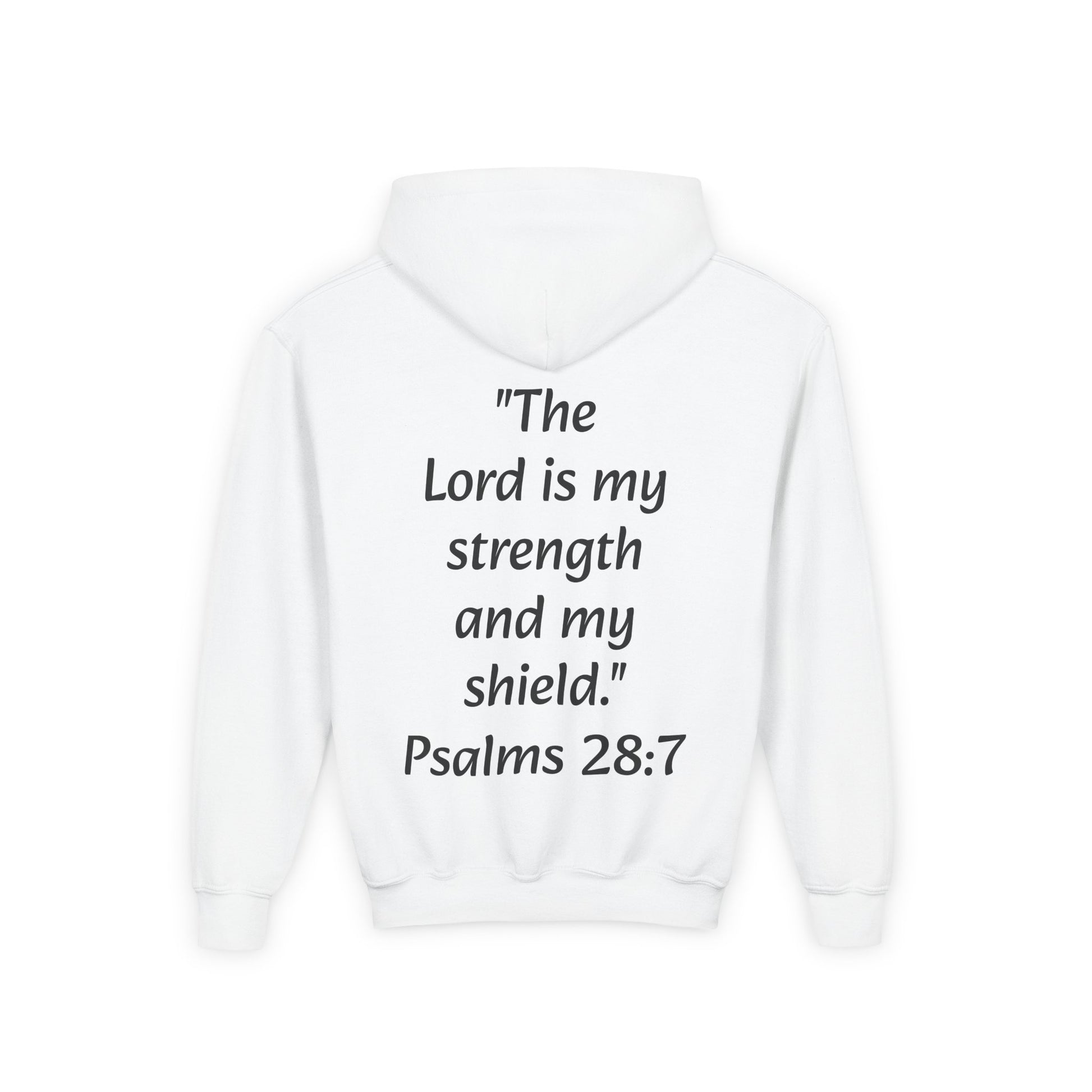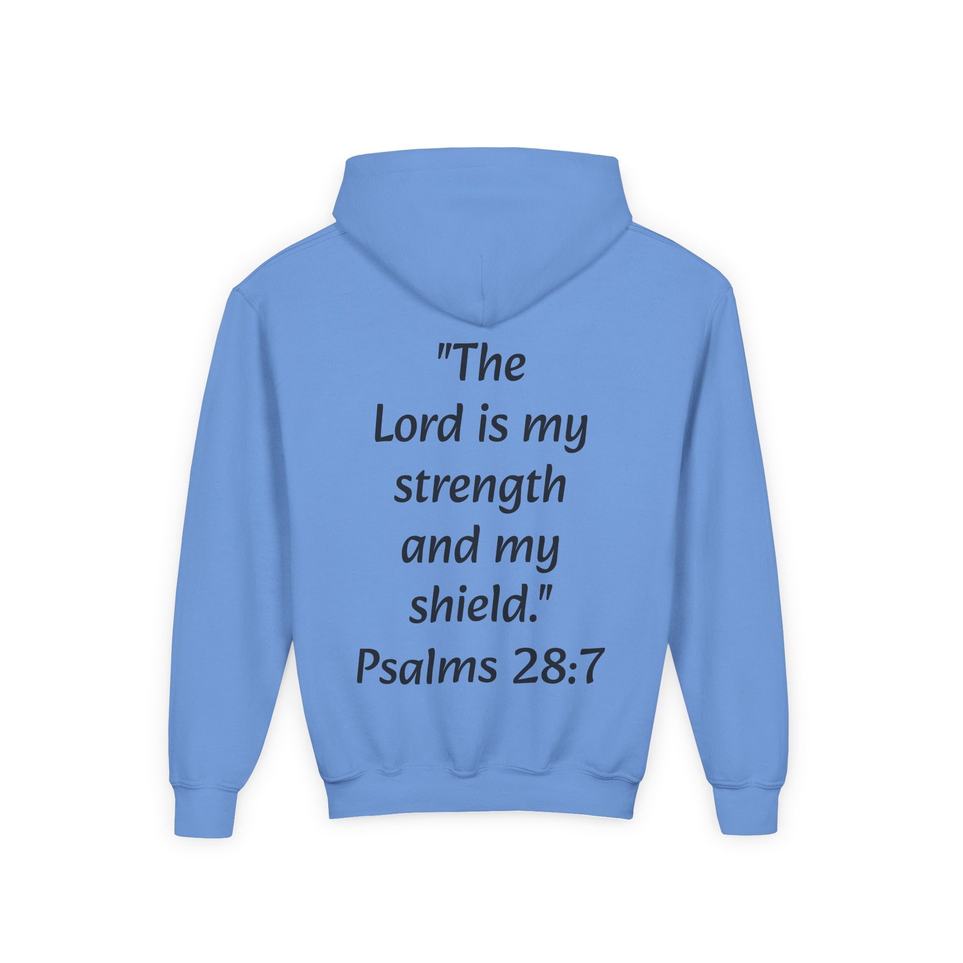 Christian Youth Hooded Sweatshirt, Faith Apparel, Gift for Teens, Inspirational Hoodie, Psalms 28:7 Sweatshirt, Religious Clothing